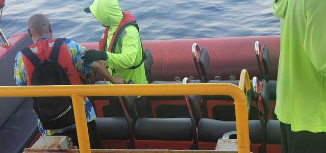 上岛的鞋子是有严格要求的,涉水鞋方便在岛上活动,但是不能勒住脚后跟的鞋是不能上小艇的。