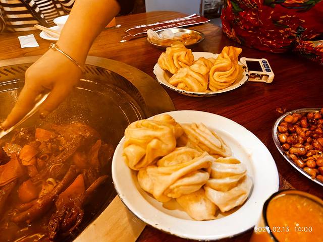 逛完长影博物馆就来东北柴火铁锅炖这里吃了铁锅炖:这家铁锅炖好像挺有名的。餐厅位置:距离市中心挺近的,就在吉林人民医院对面。 环境:纯纯的东北风格。服务:生意很火爆,等了一个小时,服务员老妹态度挺好。铁锅犒大鹅:用柴火烧的,很香。自制皮冻:很顺滑。 葱油花卷:蘸着汤汁吃好吃