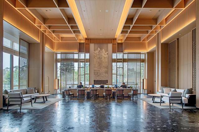 酒店的大堂酒廊设计宽敞明亮,时尚典雅,分为室内和室外两个区域,透过落地窗可欣赏湖光绿林美景,坐在户外更是流水环抱,舒适惬意,绝对是休闲放松的佳选之所。