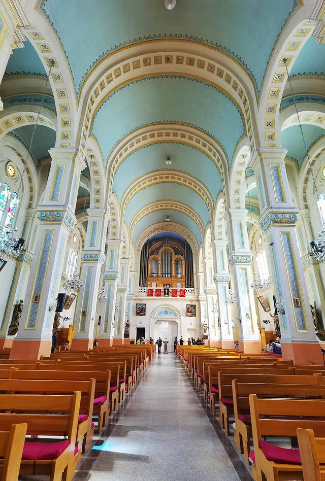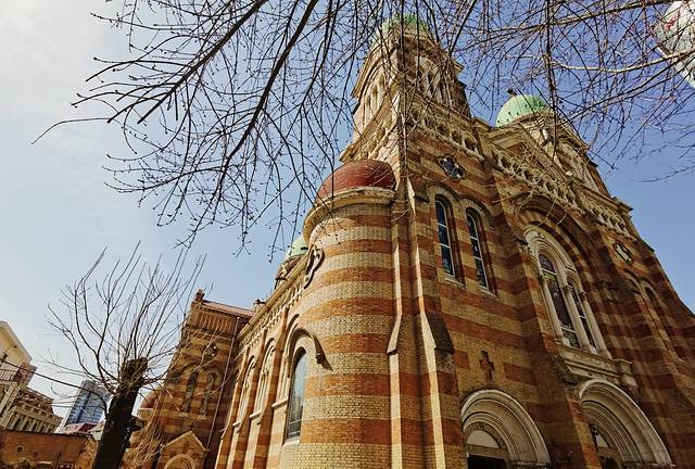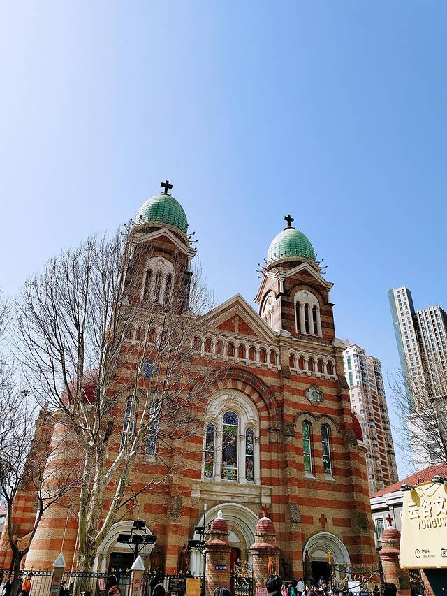 西开教堂又称法国教堂。在天津和平区滨江道独山路原墙子河外老西开一带,即今西宁道营口道交口旁,故名西开教堂。包括天主教总堂和大教堂,分别建于1914年和1917年,为法国天主教所建。大教堂采用法国罗曼式建筑造型,高45米,建筑面积1585平方米,平面呈长十字形,正面和后部耸立高大塔楼三座,呈"品"字型,楼座以黄、红花砖砌成,上砌翠绿色圆肚形尖顶.檐下为半圆形拱窗。堂内为三通廊式,内墙彩绘壁画,装饰华丽。西开教堂是天津教堂中规模最大的一座,可对外开放。