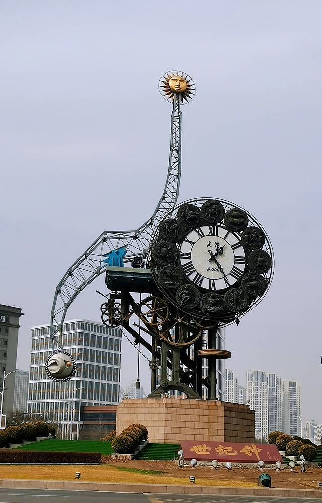 世纪钟是天津市为迎接新世纪,在天津站前广场建造的大型标识性城雕建筑。世纪钟为全金属材料,钟高40米,直径14.6米,基座面积74.4平方米,重170吨有余,分钟盘、摆架和基座三部分,通体金属,流光异彩。钟摆上下,日月辉映。钟盘圆周,众星拱卫,中西交融,天人和一。古典与现代浑然一体,寓意时空延续,时不我待。