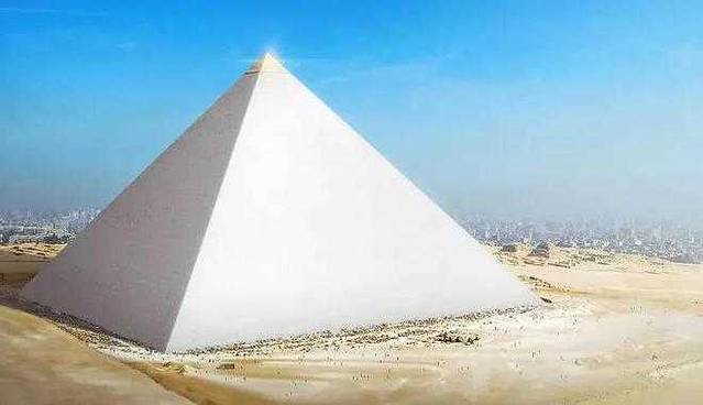 据考证金字塔刚建成时表面是光滑的白色石灰岩,而塔尖则是金子做的金顶