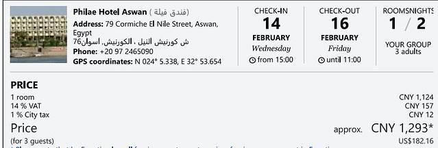 2.14-2.16 阿斯旺 菲莱酒店:三人间,网上扣419元/人