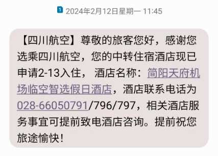 利用川航的转机优惠,免费预订了一间酒店至晚上10点,
