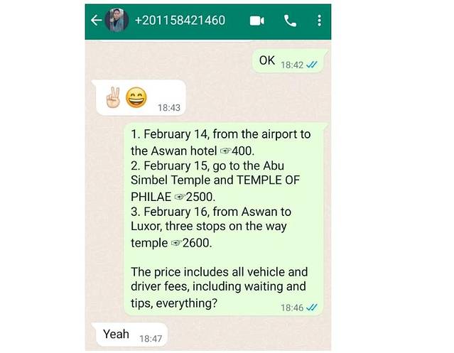 然后,WhatsApp上聊的蛮好, 卢克索 一天8小时陪伴跟随,哈 布城 、帝王谷、 卡纳克 三个地方,