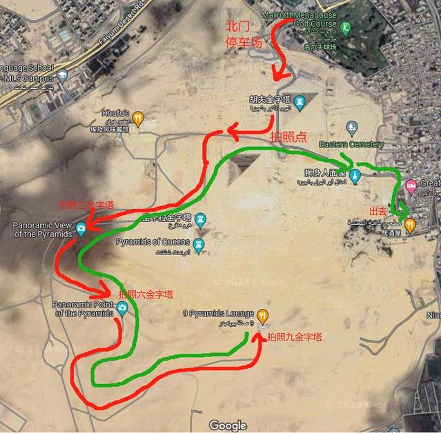 景区北门入口→胡夫金字塔→ 卡夫 拉金字塔→孟 卡拉 金字塔→三塔观景点→六塔观景点→九塔观景点→狮身人面像→景区东门出口