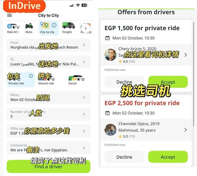在发布行程时,最好再备注栏注明“Foreigner, Not Egyptian”,因为有些司机不愿意接外国人的跨城包车单,你一定要在聊天框内和他确认行程。
