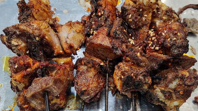实际上算是饼夹串,饼是烤饼,极酥脆,近似烤馍片了。烤肉其实很平常,但性价比还不错,11块钱一饼四串,算是不错的果腹小吃。