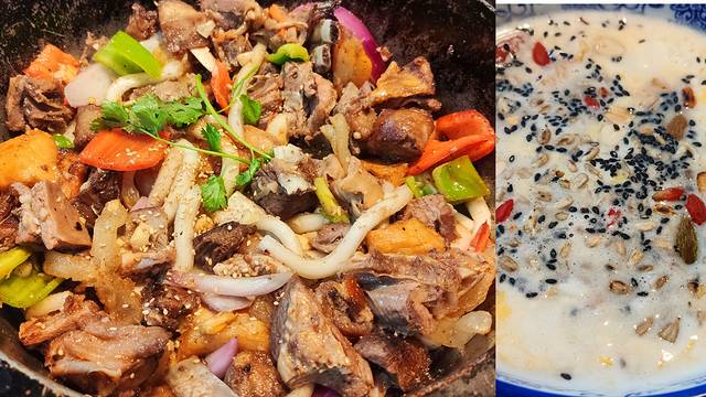 西宁这边餐馆里的基本款茶水,基本上到哪都是先上一壶这个。做法是茯砖茶煮开,加盐、花椒和其他的香料,可能初尝没那么好适应,也不是很解渴,但去腻是很优秀的,是吃肉的好搭子。不过我个人吃肉时相对更喜欢配酸奶。