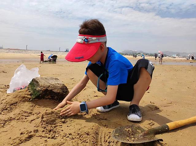 退潮之后,沿着礁石,找寄居蟹、抓小鱼、逮小蟹、挖蛤蜊就是最大的乐趣。温热的海水里,成群的小鱼逐浪而游,我们成功网到好多条。