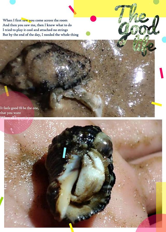 退潮上岸的寄居蟹,发现时使劲往沙里蹲。抓到手,它在钳子缝隙里偷看。