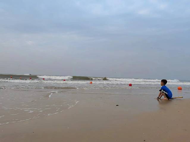 没有阳光,蓝天、碧海、金沙滩的颜色没有那么鲜艳,但是这里的沙滩还是最细腻的。儿子踩脚印、堆沙堡、追浪花,玩的甚是开心。