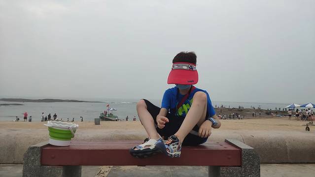 吃过午餐,儿子穿上泳衣,在齐膝深的海水中欢快畅游,并且尝到了海水的味道。