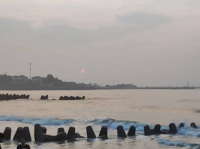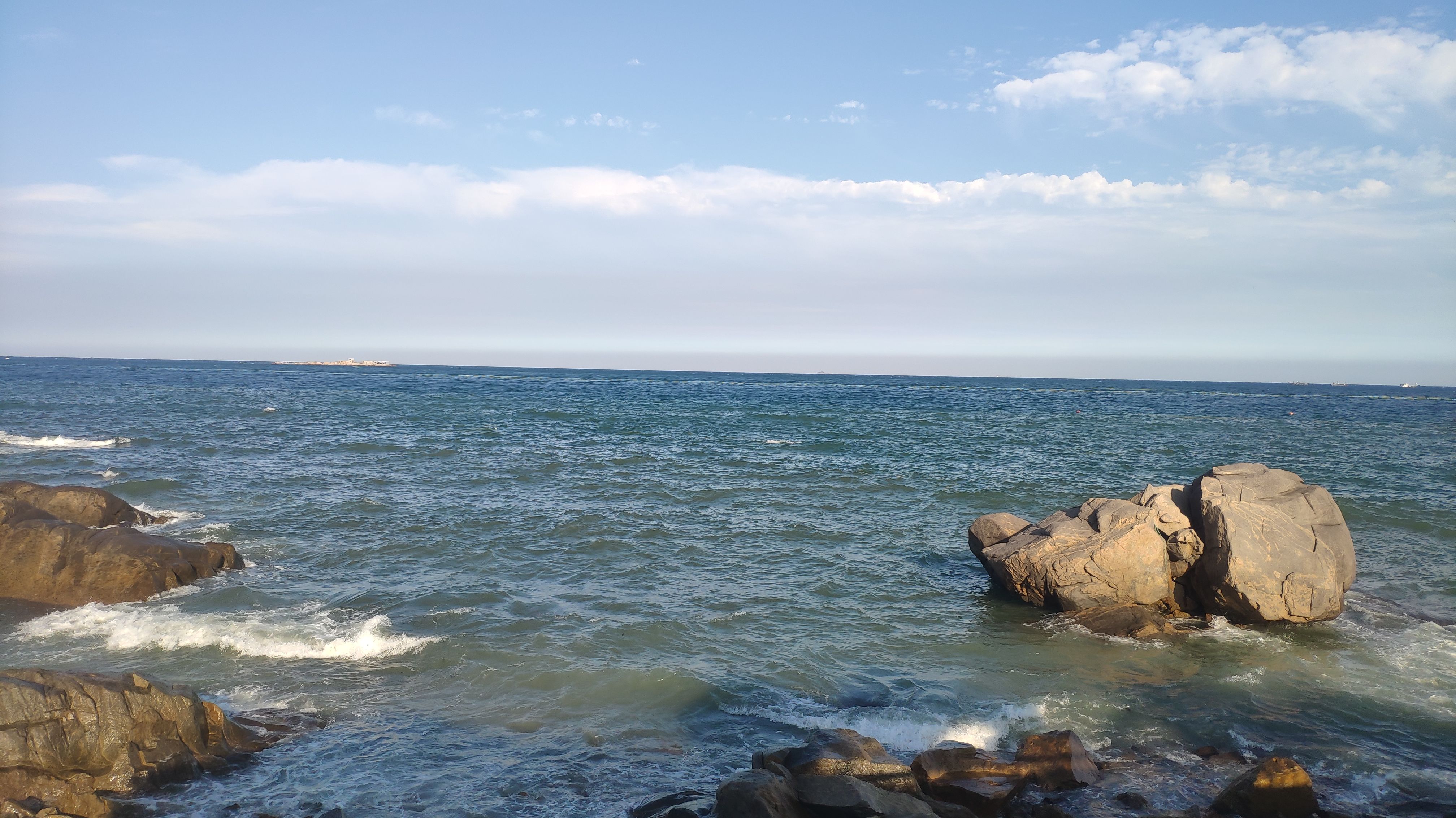 5:02到达山海天浴场,也就是常说的第三海水浴场沙滩。今天貌似阴天,没有看到鸭蛋黄一样的朝阳,隐隐约约的也能看到云层之中有万丈光芒在努力绽放。