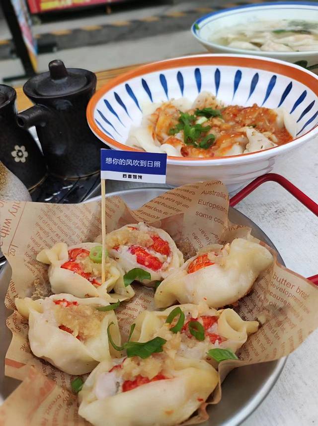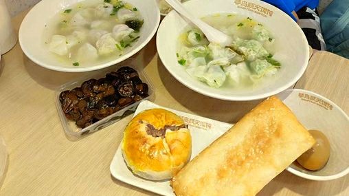 我们选在四喜馄饨店,店面干净整洁,装点一新,馄饨品种丰富,色香味俱佳。旁边有个煎饼摊,打包了裹一整条鲅鱼肉的煎饼,值得品尝。