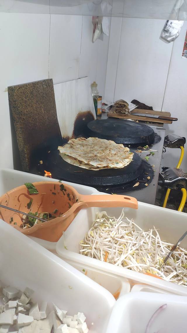 起床已是10:00,先到美达尔对面、即墨路小商品批发市场门口的中华名小吃口留香煎饼果子901总店(市北区聊城路51号)打包两套煎饼。