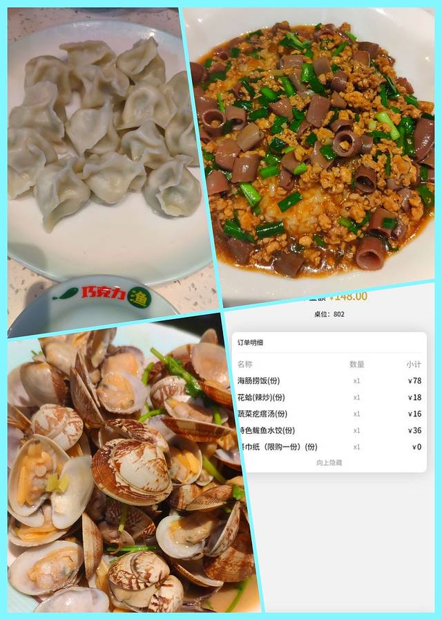 品尝了海肠捞饭、辣炒花蛤、特色鲅鱼水饺、蔬菜疙瘩汤,花费148元。真心推荐海肠捞饭、特色鲅鱼水饺,两个字:鲜美。