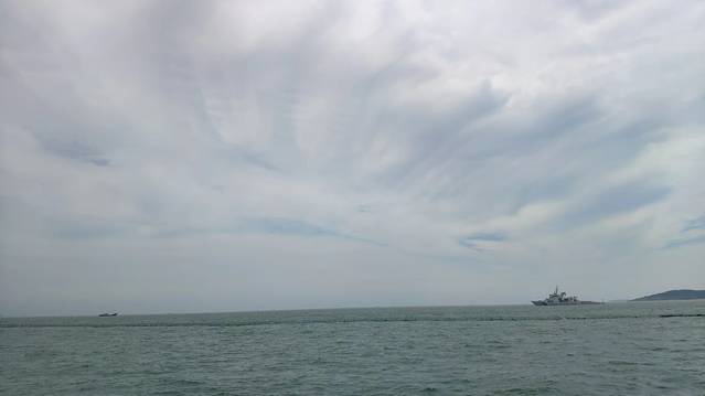 威武霸气,剑指苍穹,海面上是舰艇展区。