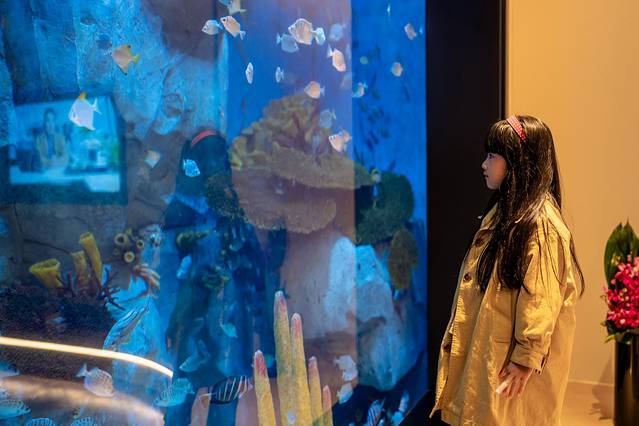 地下15层,第一次按电梯按到了负15。整体是loft复式的房型,一楼是客厅,二楼是卧室。一打开门,整面墙的水族缸还是震撼到了饭饭,她问我,今天我们是和小鱼做邻居吗?真是深坑酒店的宝藏房型。