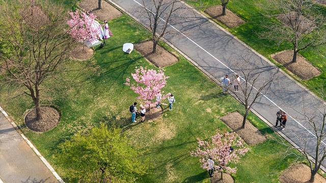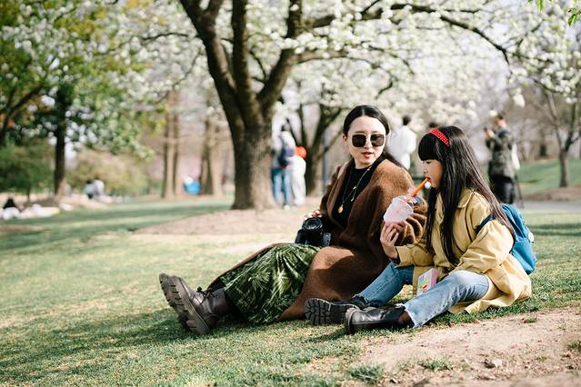 让人坐在草地的小山坡上仰拍,也可以借助樱花前景俯拍,再带些镜子、书等小道具拍些樱花特写,都可以有效避开人群。