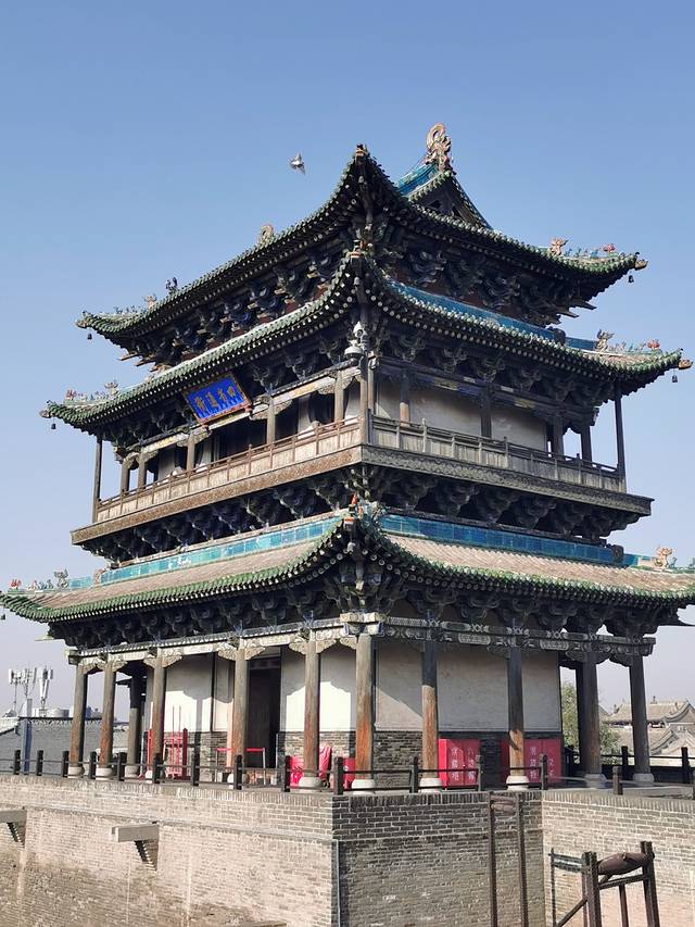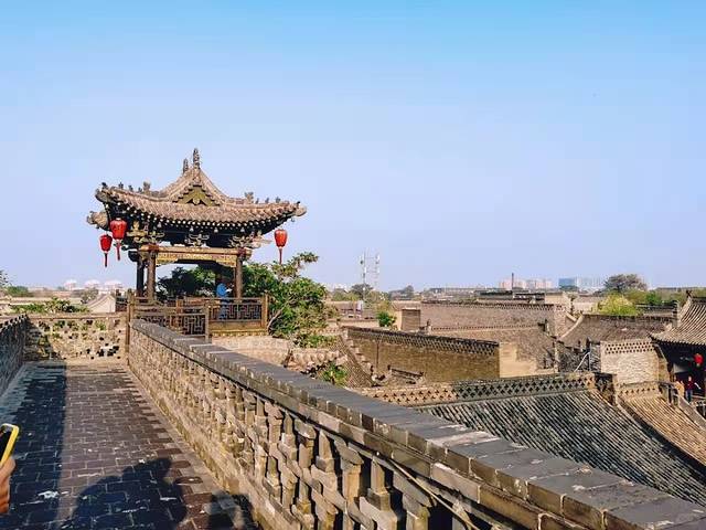 城墙上可以从另一个角度,重新审视这座古城的每个角落。蓝天白云下,大街小巷的繁忙景象,青砖灰瓦的街巷与每个来到平遥的人,正在发生着值得怀念的故事。每一块砖,每一片瓦,都在时光飞逝的岁月里见证着古城里发生的故事。