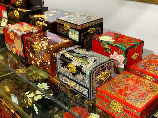平遥的推光漆器是推光漆器的代表,以手掌推光和描金彩绘技艺著称。古城南大街57号的永隆号是平遥最大的推光漆器展厅,店里摆满了玲琅满目的漆器,摆件、首饰、首饰盒都有。