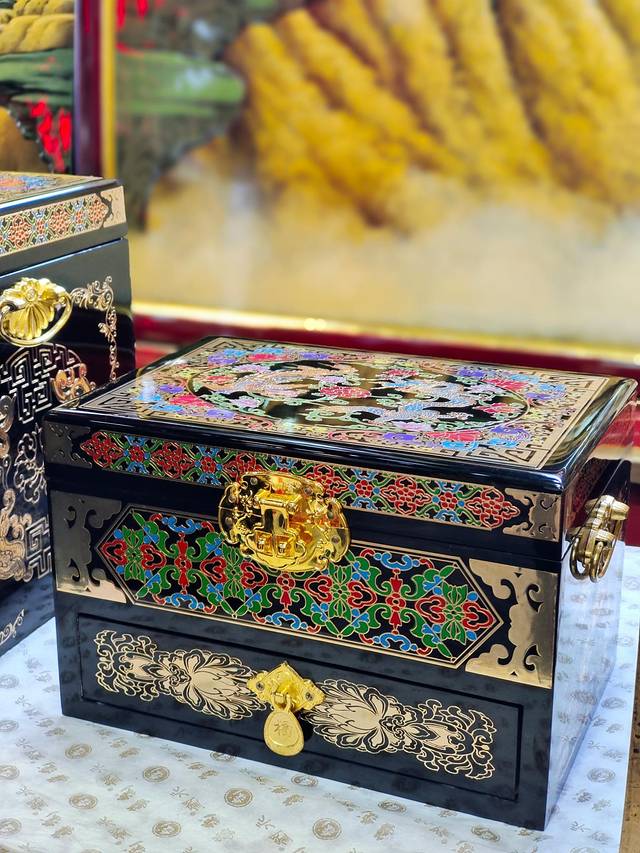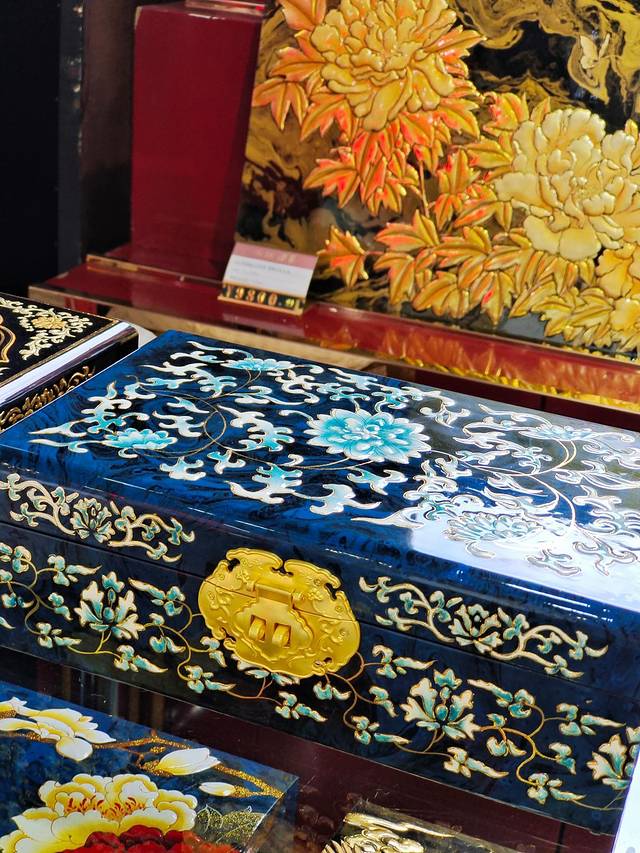 其中我最喜欢的就是各种颜色各种图案的首饰盒了,真的没有一个女孩子能拒绝得了这种华美,每一个都是流光溢彩独一无二的,还有专门的小姐姐讲解推光漆器是历史,深刻感受到了非遗文化的魅力。