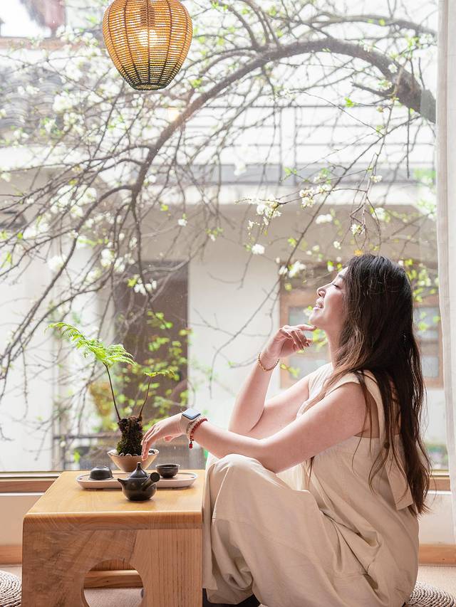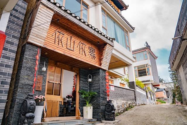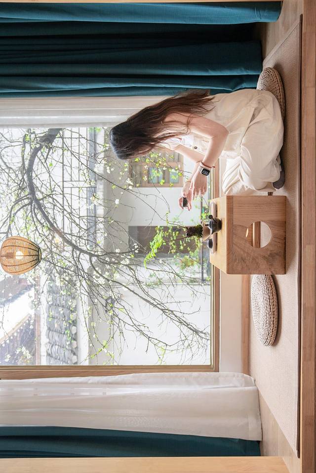 晚上入住依山依寨民宿,木质建筑房屋古朴典雅,最惬意的时光是坐在飘窗上品茶,观窗外花。