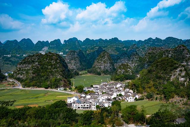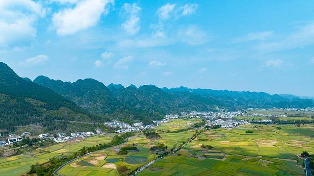 贵州寻花之路差不多接近尾声,我们来到了安顺的云峰屯堡,油菜花海如同地毯一般铺展开来,让人眼前一亮。