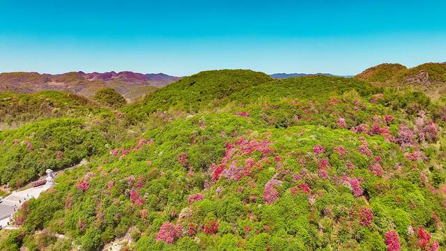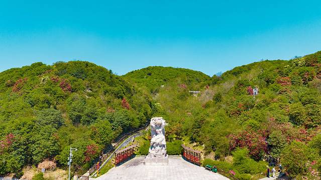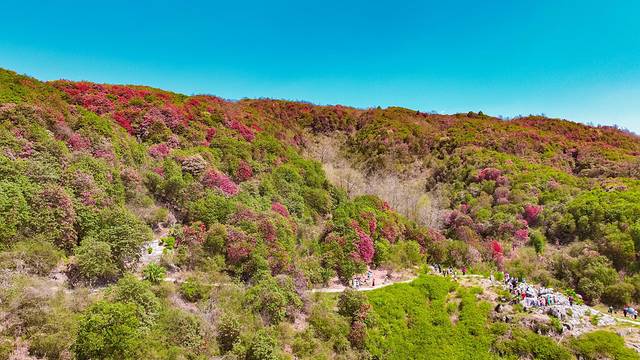 我乘景区观光车上山,沿途看全是花树,就很像我们生命灿烂的高光时刻。而到山顶观景台俯瞰满山成片绚烂的红,我突然觉得这些杜鹃花就像生命里的炙热,毫不吝啬能量,热情的拥抱天空,奔放热烈!