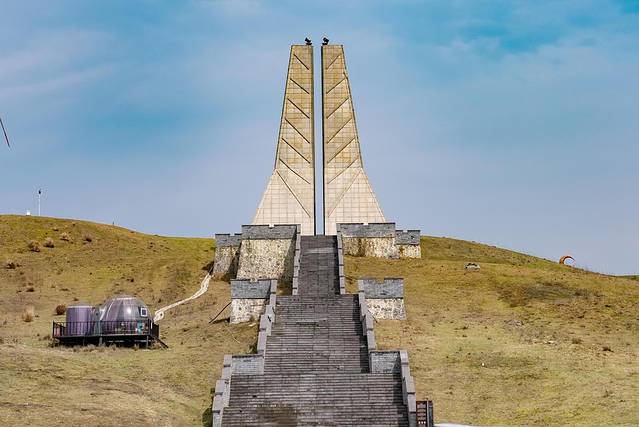 站在草原上,旋转的风车之下有一道天空之门,透着远古神秘的宏伟感。