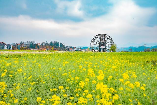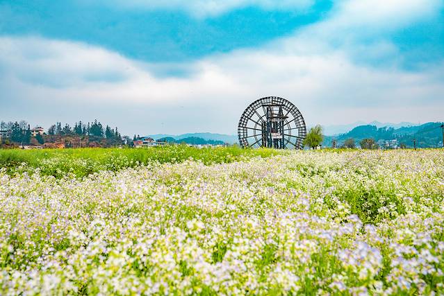远处的摩天轮、水车和黄白花相间宛如大自然的调色盘,让人陶醉其中。