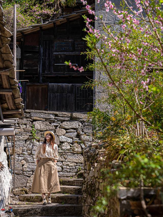古村落里,石头瓦片砌的屋顶和木质房屋在讲述历史过往。落日阳光下,那片油菜花田闪闪发光,犹如一幅美丽的油画。