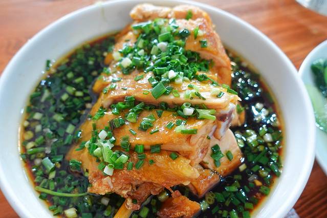 油淋鸡,肉嫩皮脆,油脂香味很香,酱油+葱油味道不咸很提味。