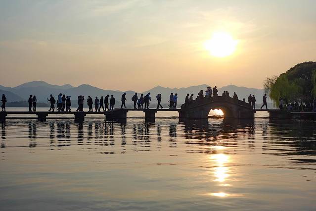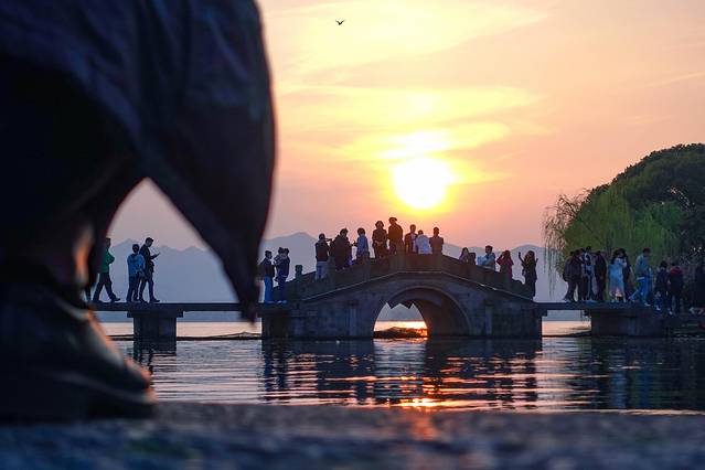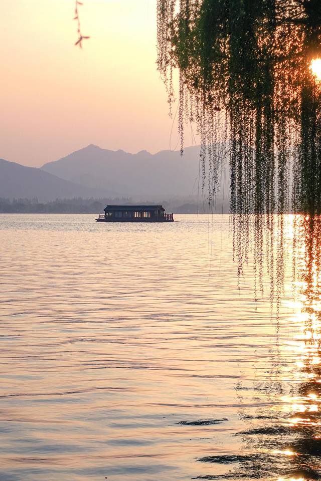 傍晚正好在在涌金桥公园附近了,就去湖边吹风了,日落时分太美妙了,想一直在西湖边吹风。春风拂动刚发芽的柳树枝,水面亮亮的。