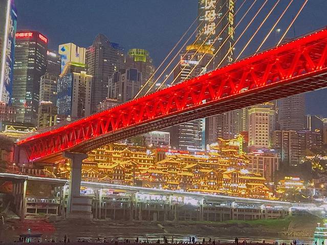 洪崖洞里面没什么看的,要看夜景要等7点亮灯,位置去的千厮门大桥底下,在洪崖洞江的对面。从大剧院那边下去,有很多人在那里等