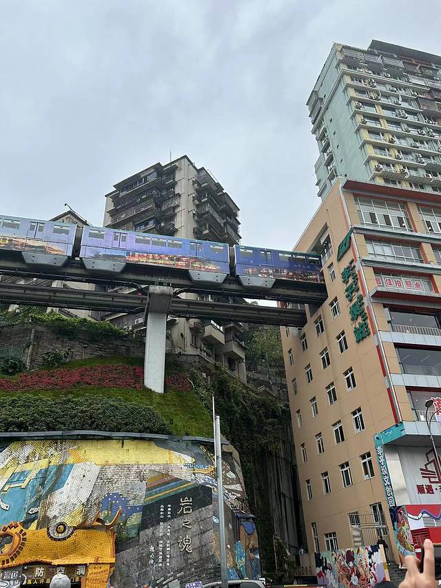 一大早来看地铁穿墙,不用到地铁第一节车厢,因为贴了宣传画,看着不方便。不禁感叹重庆造景的能力,很独特,但是你说很好看吧也不是,就是一种特殊的体验