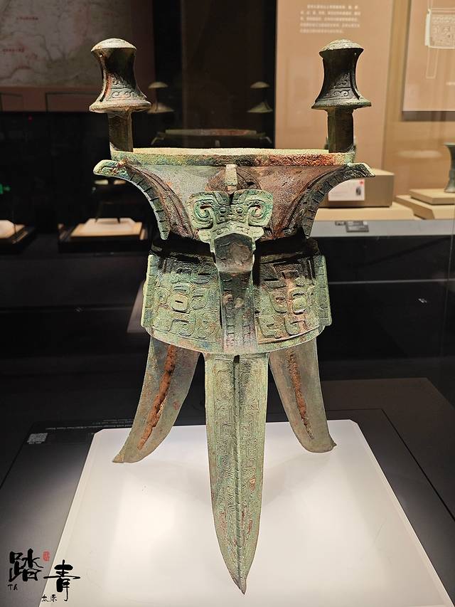 商,高42厘米、口径21.5厘米,个头很大,横截面为圆形。口沿两边耸立着两根立柱。立柱上部是沙漏了形状,上边较小,圆顶突起;下边稍大,平底略敞。立柱上饰三角纹和卷云纹,且有三道平浅的扉棱。