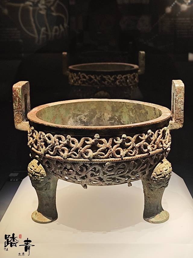 春秋,通高24厘米,口径26.3厘米,新绛县柳泉村出土,附耳折边,弧腹平底,下承三个兽蹄足,鼎腹有内外两层。蟠蛇纹镂空鼎是晋博所有鼎类青铜器中造型最特殊的一个,鼎腹有内外两层,顶腹外层是在鼎颈和底之间附加的,为两周镂空蟠蛇纹,表现为头高昂、身体卷缠似游动的群蛇形象,内层即鼎腹,兽蹄足根饰兽面纹。这种外层镂空铸造群蛇形象是传统的铸造工艺难以达到的,为目前国内所见用“失蜡法”铸造铜器最早的范例。而这种青铜器铸造方法大量的出现在湖北曾侯乙墓出土青铜器中,而且曾侯乙墓中出土的使用失蜡法铸造的青铜器更大、更复杂、更精美,具有明显的技术延续性。
