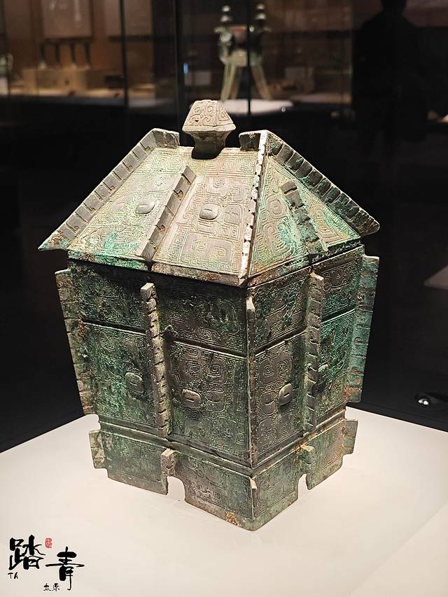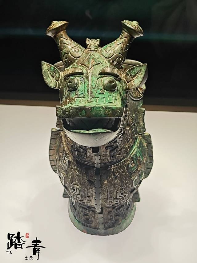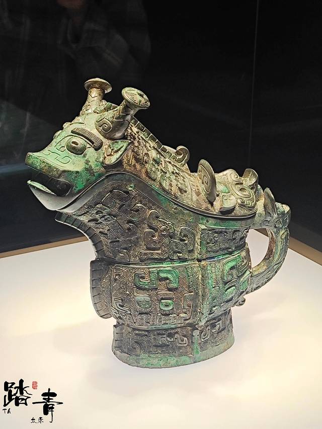 商,高21.5厘米,长24厘米。1976年灵石县旌介村出土。酒器。整体状如蹲兽。前有宽流,下承高圈足。盖前端为龙首形,与上翘的流口扣合为颈,高浮雕粗角、尖耳,眉目突出,颈部起扉棱至盖面中部;盖后部作兽面,双耳高耸;器腹前、左、右起扉棱,后有兽首形鋬。盖部以云雷纹衬托两个兽头,器身则以三条扉棱为中轴组成兽面主纹,口沿下饰昂首卷尾夔龙纹,圈足饰夔凤纹,均以云雷纹衬地。三层花纹。商代晚期青铜器精品。