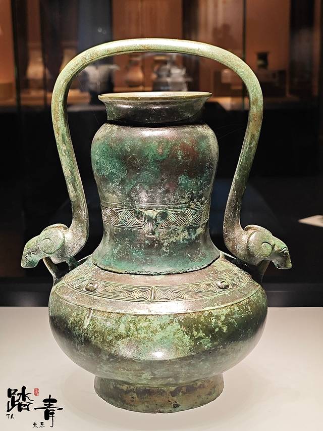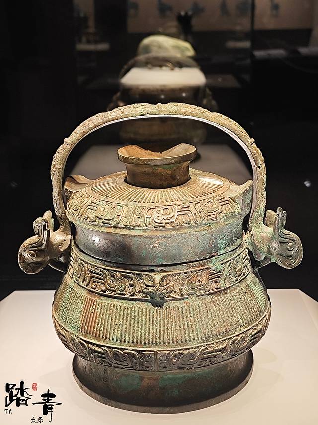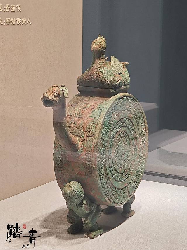 西周,高34.6厘米。1992年曲沃县北赵村晋侯墓地31号墓出土。盛酒器,出土于晋献侯夫人之墓。器体扁圆,顶有长方形口,口沿外侈,上有圆雕的振翅鸟形盖,以熊形链条与器体相接,前有昂首曲颈的龙首形流,后为兽首形鋬(pàn),器下为两个祼体的半蹲人形足,身前倾,背负器身,表现出两人负重时的姿态。盉身上部饰体躯相交的龙纹,两侧由内向外依次饰蜷曲龙纹、鳞纹、斜角云纹。