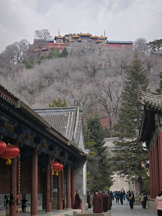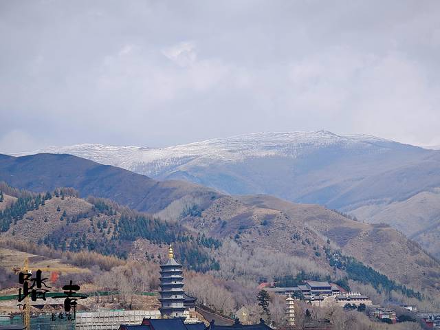 是从北门离开五台山的,前两天还因为下雪,下山都是盘山公路,非常滑。可以远眺东台,上面包括路边全是积雪。