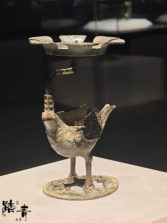 战国,通高14厘米,整件文物造型为一只振翅欲飞的小鸟,立于镂空圆形底座上鸟首处接一曲折状盘柄,上承一莲瓣形灯盘鸟首与鸟尾高高翘起,脚下双爪踩着一只虎,虎爪抓着两条蜿蜒盘曲的蛇,小鸟造型活灵活现,羽毛刻画得极为细致,工艺之精湛令人惊叹,从灯盘镂空以及中间的灯钎推测这件灯可能是插蜡烛使用,整只灯大量使用了镂空设计,配上灵动的小鸟形象,非常可爱、动人。