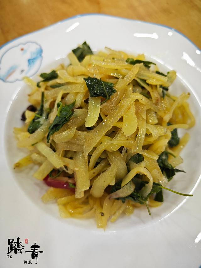 山药拌杨树叶,当时觉得浑源的山药为什么是黄色的,以为是品种不一样,后来听出租车司机说的当地管土豆也叫山药,所以这道菜准确的说是土豆丝拌杨树叶。杨树叶到底是什么,离开浑源也没弄明白。