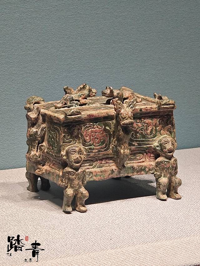 春秋,盒作长方箱式,下承人形四足,顶部双翻盖,设虎形双钮,方盒四面中央各攀爬一条回首龙纹,盖面和四壁饰变形龙纹,造型奇特,做工精巧。这类器物多出于女性墓中,可能用作盛放化妆用品的奁盒。