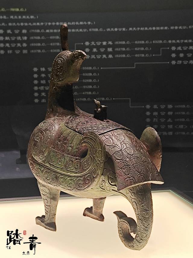 西周,高39厘米,长30.5厘米,宽17.5厘米。2000年曲沃县北赵村晋侯墓地114号墓出土。盛酒器。出土于第一代晋侯燮父墓中。整体造型为伫立回首的凤鸟形,凤尾下弯成一象首,与双腿形成三点支撑。器盖和腹底铸有铭文,“晋侯作向太室宝尊彝”,说明该器为晋侯宗庙祭祀的礼器。