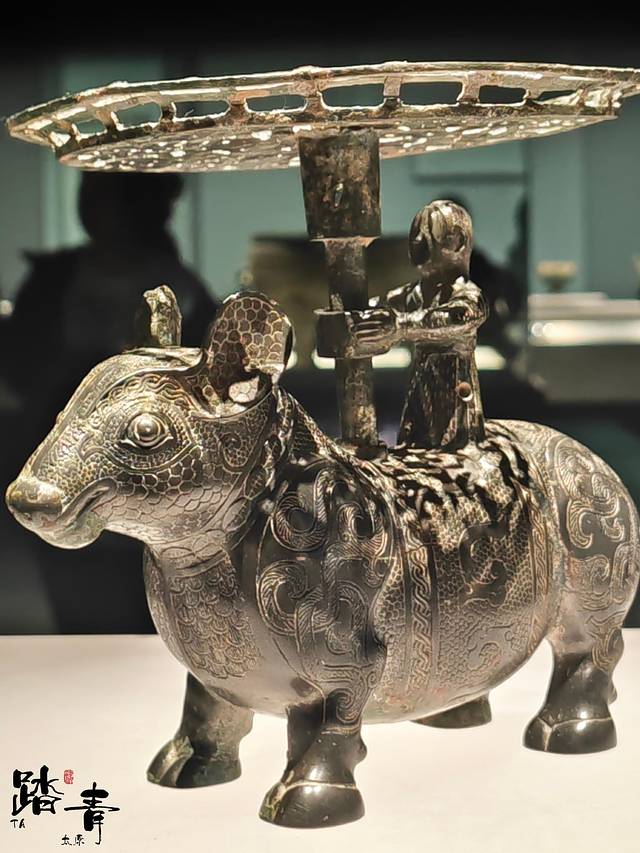 战国,高14.5厘米,长18厘米,盘径14厘米,重1.38公斤。1965年长治市分水岭出土。盘为圆形,侈口,平底,下接支柱,可以灵活转动,盘底以镂空蟠虺纹装饰。牺牲体肥硕,面部表情温顺,双目圆睁,长吻大耳,四足短而粗壮,站立平稳,牲背上站立一人,面目清秀,束发垂脊,身穿右衽长袍,双臂前伸,手握盘柱。“牺”是古代祭祀所用牲畜的称谓。该器的功能尚待进一步研究。