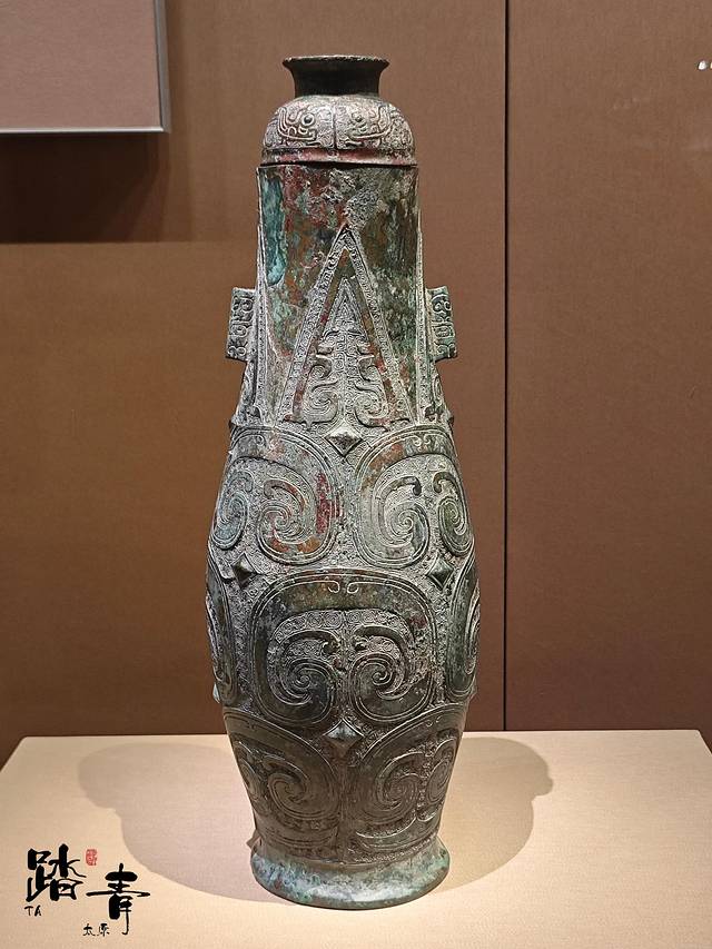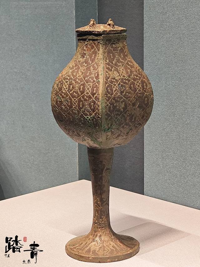 春秋,高28厘米,最大腹径8.9厘米。1988年太原市金胜村赵卿墓出土。共2件,大小、形制、纹饰相同。盝顶式盖,上有四个对称环形小钮,以子口插入壶的母口内。壶为小方口,颈部微敛,溜肩,鼓腹,下腹内收形成平底,下承高柄喇叭形足。盖面四角饰心形图案,中央方框内两龙呈“卍”形相交,龙昂首卷尾,其一加绘黑线,以示雌雄之别。壶身饰菱形和几何纹图案,高柄和圈足饰三组神鸟纹,鸟昂首阔步或伸颈长鸣,寓意深奥。该壶纹饰内嵌多种矿物组成的黑色物质,主要是石英、长石、褐铁矿、锡石、孔雀石等成分组成,制作精美,极富装饰效果。