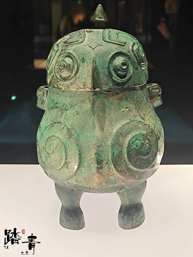 商,高19.7厘米,口长径12厘米,短径8.6厘米。1956年石楼县二郎坡村出土。盛酒器。形如两鸮相背而立。盖为双鸮首,环目,尖喙,弯眉,盖中央置四阿顶方柱钮,饰雷纹。腹作双鸮身,子口微敛,垂鼓腹饰卷曲羽翼纹。身下为四爪,两两相背。盖腹相合,两鸮昂首背立。商代晚期青铜器精品。不仅实用,也是精美的艺术品。鸮是我国古代对猫头鹰一类鸟的统称。