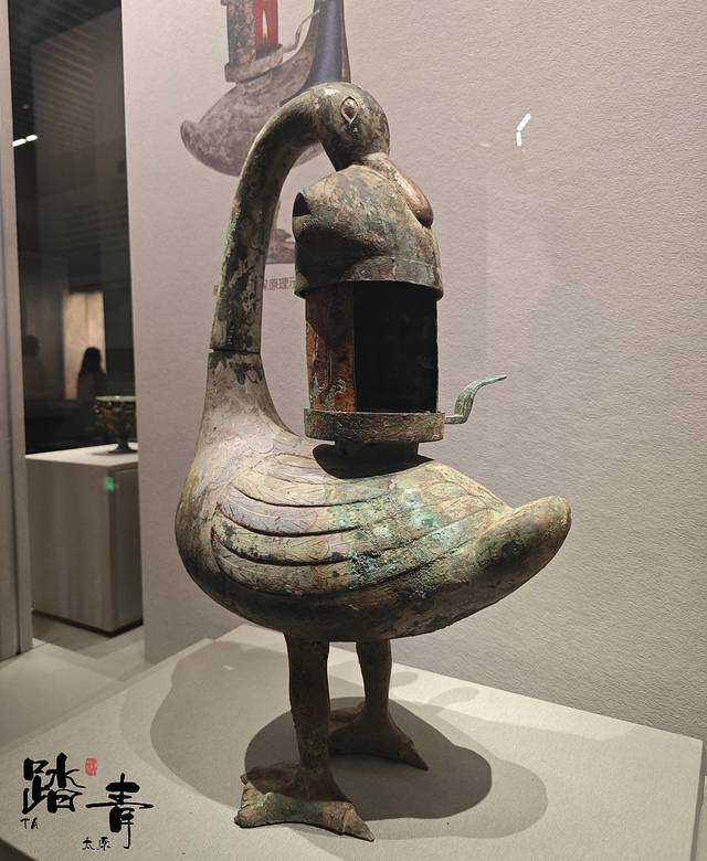 汉,高58cm,长40cm。1986年襄汾县吴兴庄出土。鸿雁伫立,回首衔鱼,雁颈与灯体以子母口相接,鱼身与雁颈、腹腔中空相通。圆形灯盘附柄,可自由转动,盘下圈足与雁背直口套合。鱼腹部与灯盘相对应为圆形覆口,覆口与灯盘之间插立两块弧形屏板,交错开合,既能挡风,又可调节灯光亮度,灯火点燃时,烟雾通过鱼腹和雁颈导入雁腹,可防止油烟污染空气。屏板、鱼鳞和雁翅均有彩绘。